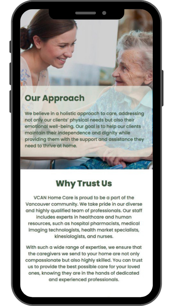 The new website transformed VCAN Home Care’s digital presence into one that mirrors the quality of care they provide. Families can now connect easily, explore services with confidence, and feel reassured from their very first visit online. The redesign has helped VCAN Home Care position themselves as a modern, trustworthy, and compassionate leader in home care services.